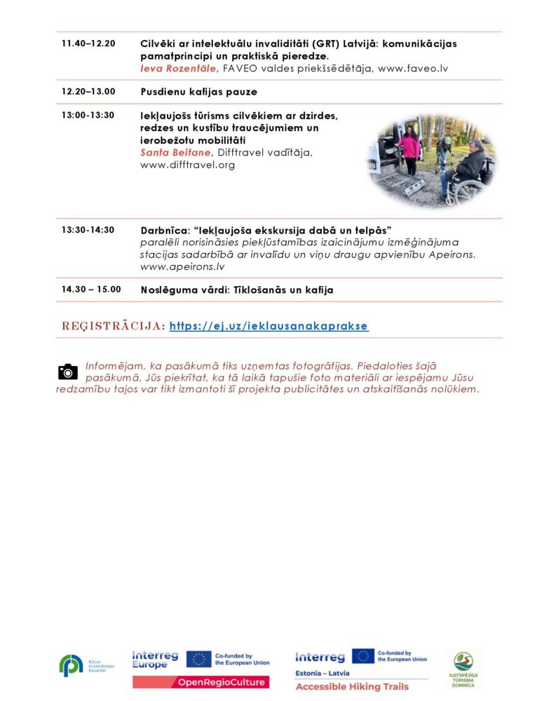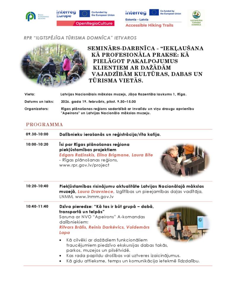 Pasākums tiek organizēts Eiropas Interreg starpreģionu sadarbības programmas 2021.-2027.gadam projekta “Kultūras resursu pieejamības uzlabošana cilvēkiem ar invaliditāti” /OpenRegioCulture un Interreg Igaunijas – Latvijas pārrobežu sadarbības programmas 2021.-2027.gadam projekta “Pārgājienu taku pieejamība/Accessible Hiking Trails” īstenošanas ietvaros.