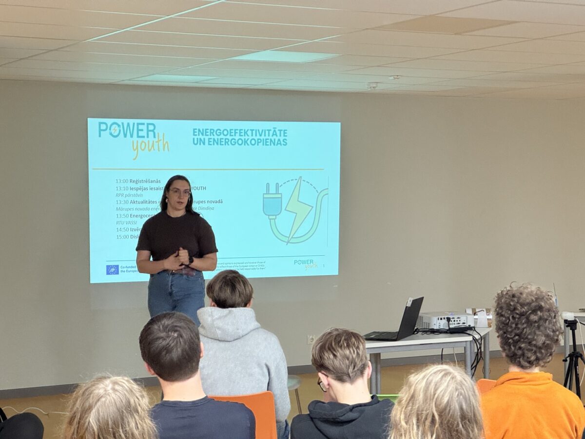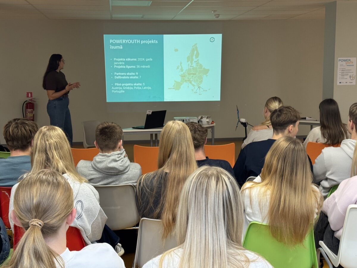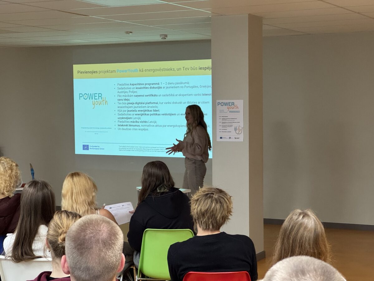 Pasākumu atklāja Rīgas plānošanas reģiona pārstāves Inga Brieze un Liega Krasovska, kura iepazīstināja skolēnus ar projekta POWERYOUTH mērķiem un iespējām jauniešiem piedalīties enerģētikas pārejas procesos.