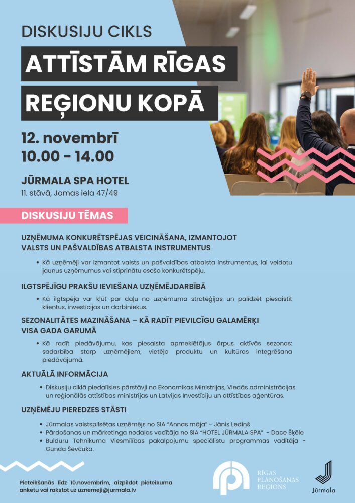 Diskusiju ciklu atklās Jūramlas novada domes pārstāvis un Rīgas plānošanas reģiona Administrācijas vadītājs Edgars Rantiņš. Diskusiju paneļos piedalīsies Ekonomikas ministrijas, Viedās administrācijas un reģionālās attīstības ministrijas un Latvijas Investīciju un attīstības aģentūras pārstāvji.
