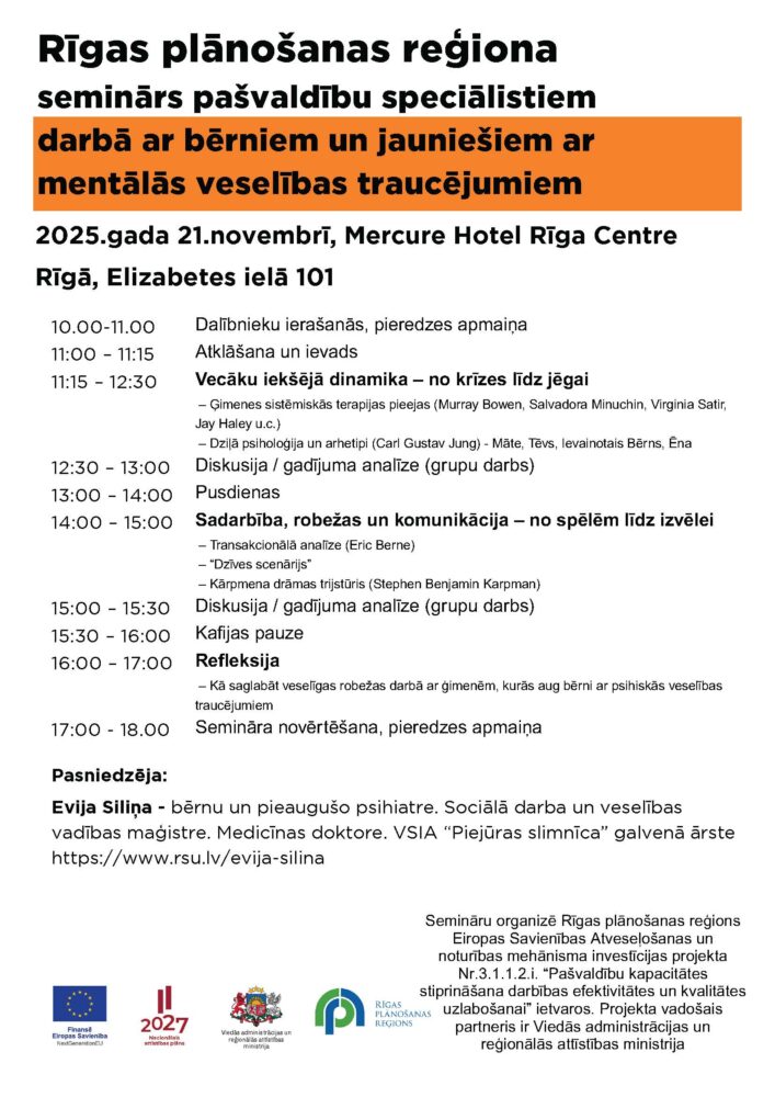 Seminārs veltīts vecāku atbalstam. Tā ietvaros notiek 3 psihiatrijas lekcijas starpdisciplinārai pašvaldības speciālistu grupai – sociālie darbinieki, psihologi, pedagogi, policijas inspektori un citi. Lektore: Evija Siliņa, medicīnas doktore, psihiatre, VSIA “Piejūras slimnīca” galvenā ārste. Semināra lekcijas:
