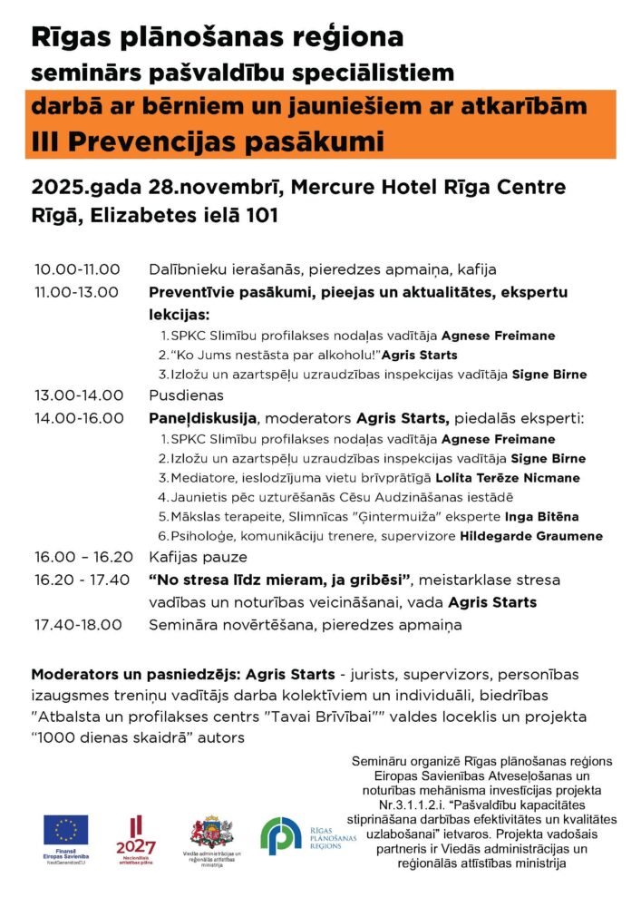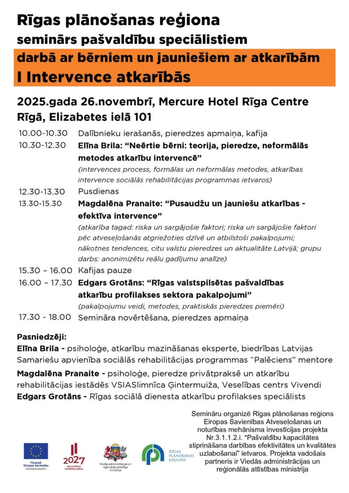 Veltīts darbam ar mērķa grupu universālu pakalpojumu ietvaros – skolā, sociālajā dienestā, policijā un citur. Lektore: Evija Siliņa, medicīnas doktore, psihiatre, VSIA “Piejūras slimnīca” galvenā ārste.