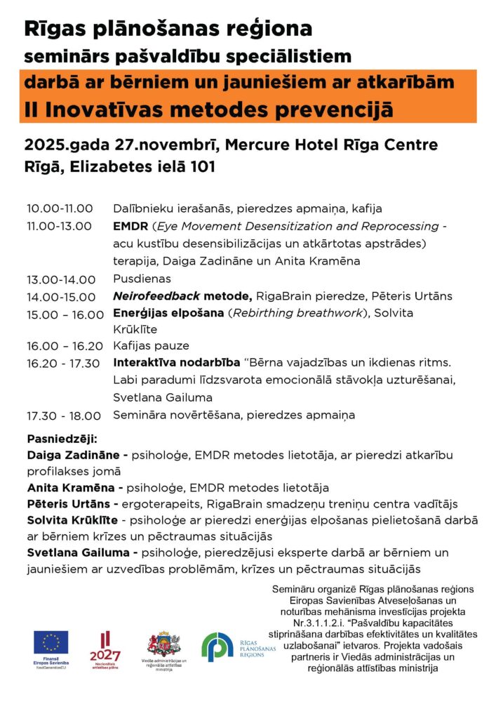 EMDR, lektores: Daiga Zadināne un Anita Kramēna, klīniskās psiholoģes, EMDR terapijas metodes lietotājas, ar pieredzi atkarību profilakses jomā;