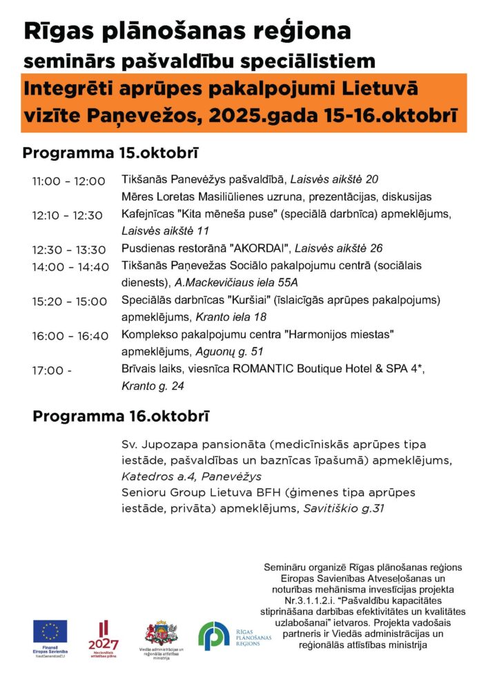 Rīgas reģiona speciālisti dosies pieredzes apmaiņas vizītē uz Paņevežiem (Lietuva), kur tiksies ar pilsētas mēri Loretu Masiliūlieni un citiem pašvaldības pārstāvjiem, apmeklēs vairākas sociālās aprūpes iestādes, kurās sociālās aprūpes pakalpojumi integrēti ar nodarbinātības veicināšanas un veselības aprūpes pakalpojumiem. Rīgas reģiona pašvaldību pārstāvji apgūtās zināšanas izmantos aprūpes pakalpojumu plānošanā jeb dizainā, pakalpojumu īstenošanā, vadībā, kvalitātes uzraudzībā un finanšu plānošanā/vadībā.