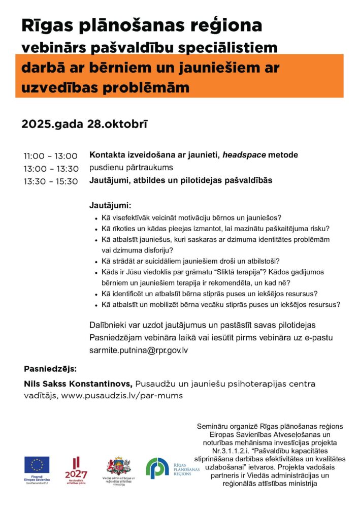 Aicinām pieteikties speciālistus no izglītības, sociālās, policijas un citām jomām, kā arī citas ieinteresētās un iesaistītās puses, kam aktuāla bērnu un jauniešu uzvedības problēmu mazināšana: https://www.visidati.lv/tk/11364638/ Vebinārā N.S.Konstantinovs īsumā informēs par klātienes semināros apgūtām metodēm, atbildēs uz iesūtītajiem un vebināra laikā uzdotiem jautājumiem, tiks prezentētas praktiskas pilotidejas, kuras speciālisti ir ieviesuši ar semināros apgūtām metodēm.