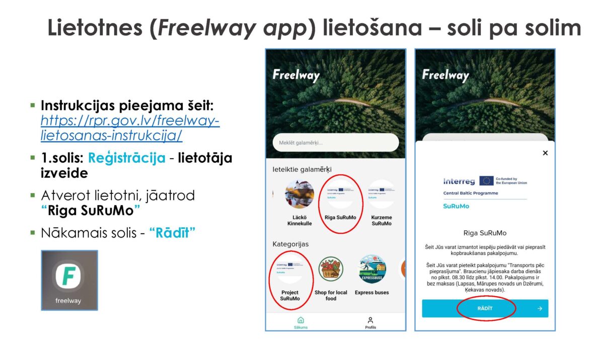 Lai lietotu šos pakalpojumos, iedzīvotājiem ir jālejupielādē mobilā aplikācija “Freelway App” un jāizvēlas “Riga SuRuMo”.