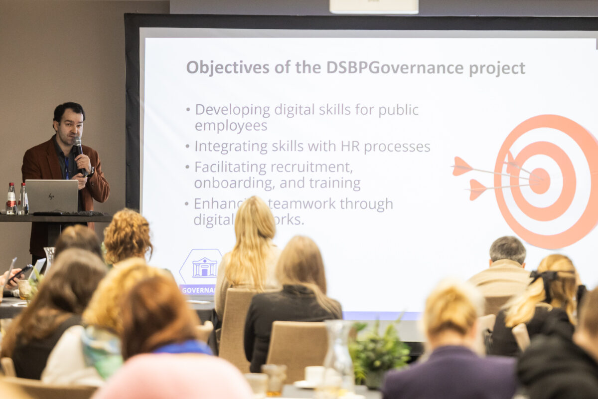 Projekta koordinators Ronalds Saksons iepazīstināja klātesošos ar DSBPGovernance projektu un tā mērķi – attīstīt publiskā sektora darbinieku digitālās prasmes, integrējot tās cilvēkresursu vadības procesos. Projekts paredz atbalstu personāla piesaistei, ievadīšanai darbā un apmācībām, kā arī komandas darba stiprināšanu, izmantojot digitālos sadarbības tīklus. Galvenais projekta rezultāts būs metodoloģija digitālo prasmju novērtēšanai, attīstīšanai un uzraudzībai, kas tiks pilnveidota, balstoties uz partneru kopīgi uzkrāto pieredzi.