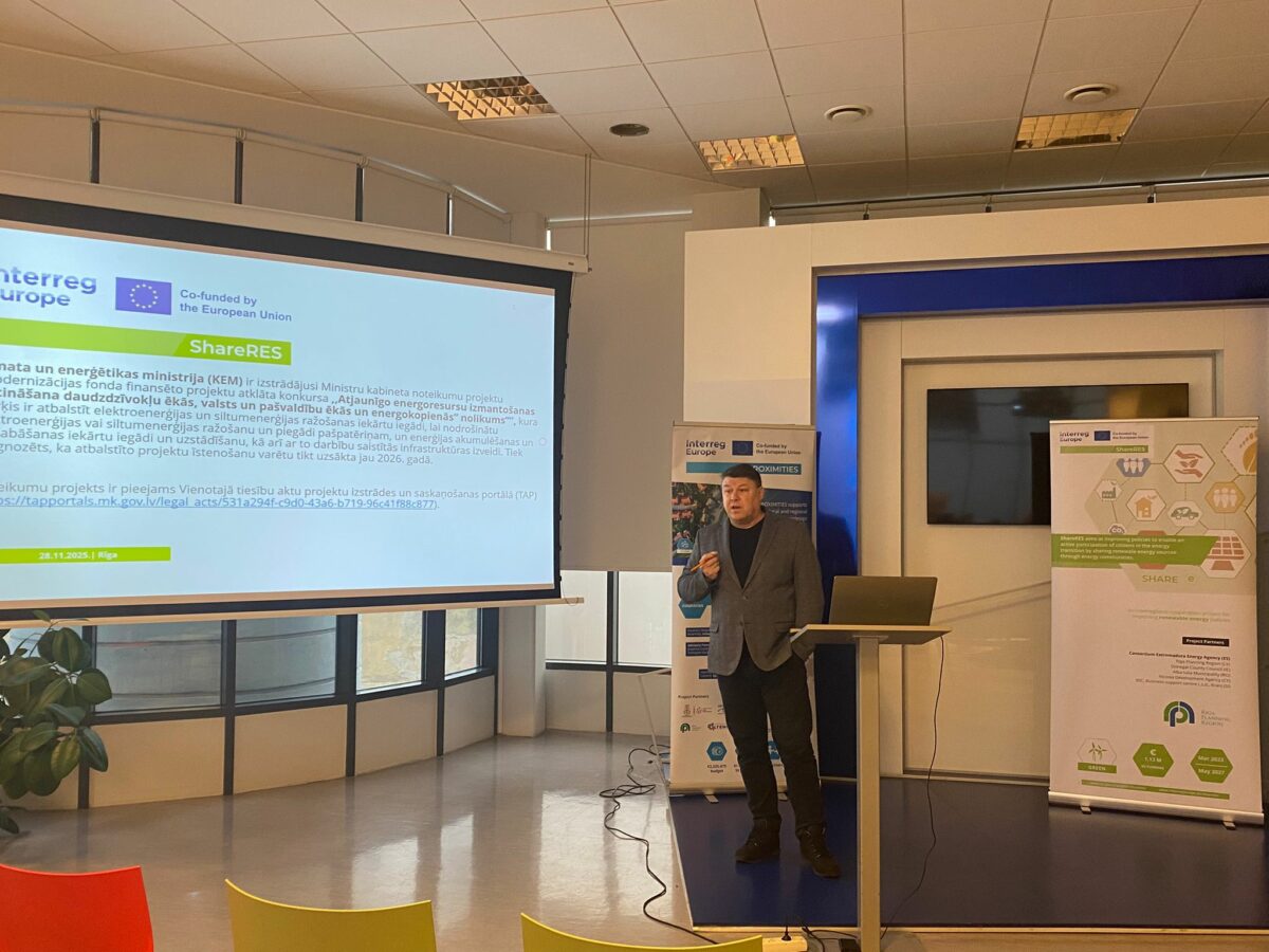 Rīgas plānošanas reģions turpina īstenot Interreg Europe starpreģionu sadarbības programmas 2021.-2027.gadam projektu Nr. 1C0212 ,,Atjaunīgās enerģijas koplietošana enerģijas kopienās” / SHAring Renewable energy through Energy communitieS, (ShareRES)”, kura mērķis ir sekmēt energokopienu darbības principu ieviešanu un pilnveidošanu, nodrošinot aktīvāku energokopienu dalību enerģijas tirgū – ražojot, patērējot, koplietojot, pārdodot un uzkrājot elektroenerģiju, kā arī iesaistoties tīkla elastības pakalpojumos vai energoefektivitātes shēmās.